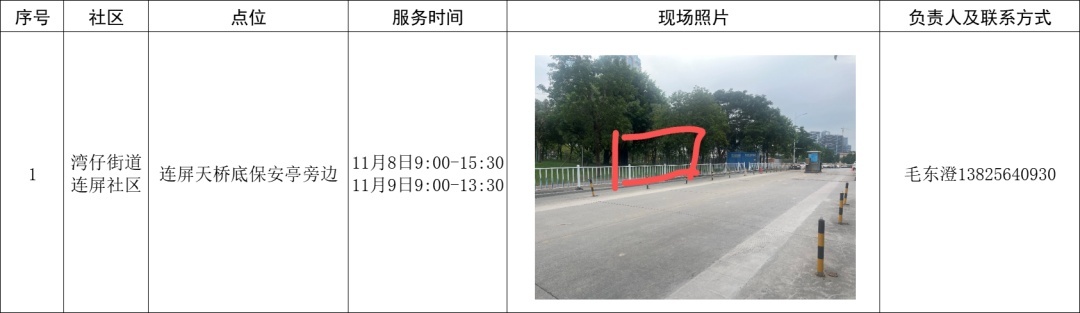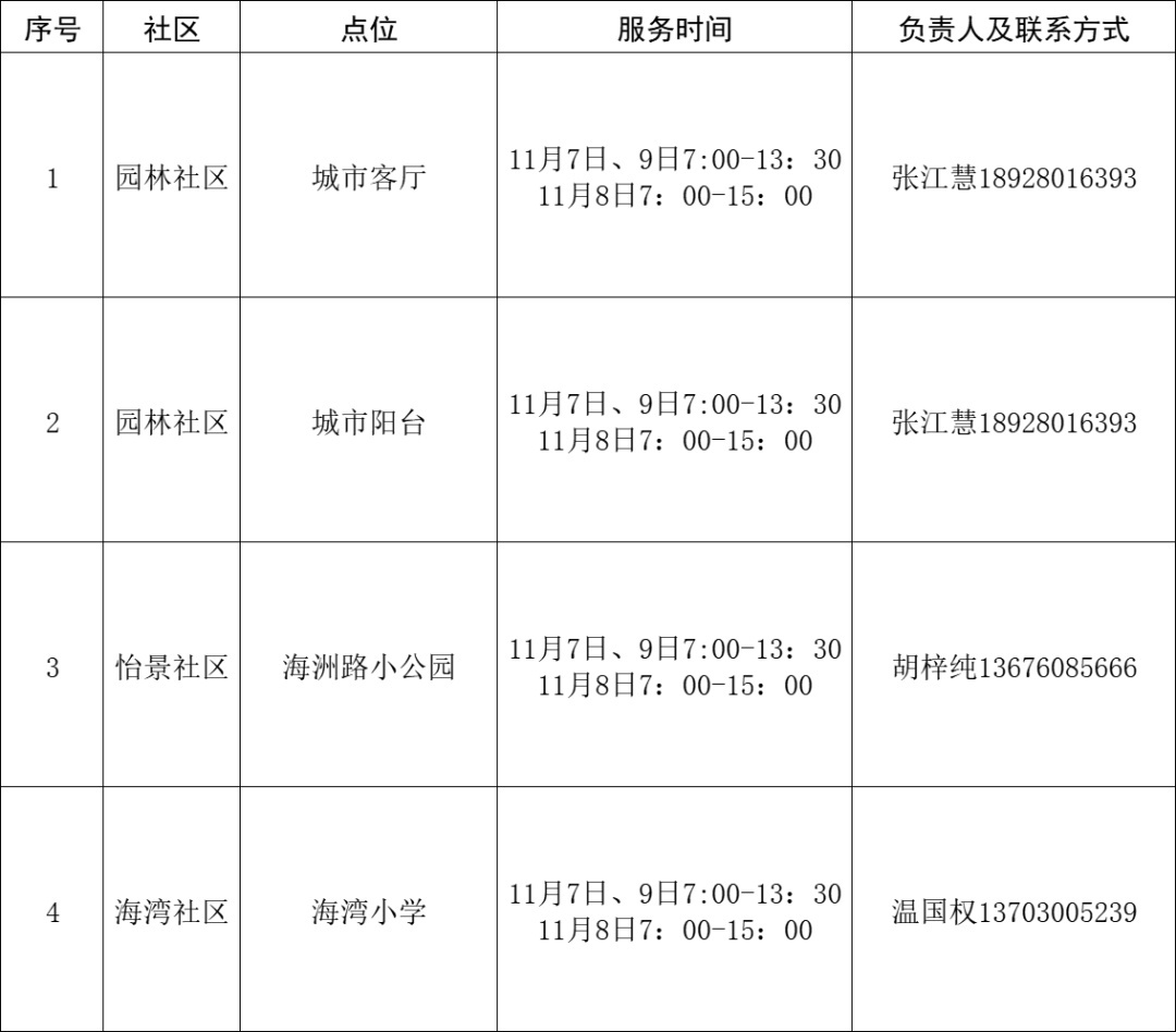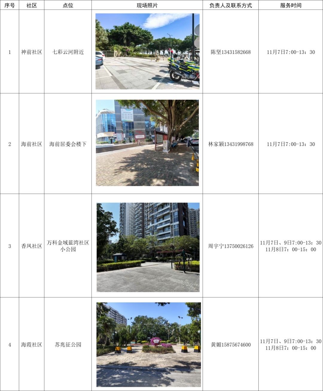 11月7日、9日7:00-13:30及8日7:00-15:00,香洲区在城市客厅、城市阳台、海洲路小公园、海湾小学、海霞社区苏兆征雕像小公园、香凤社区华仁堂大药房附近小公园、海前社区居委会门前空地、美丽湾市场等处设置多个便民服务点。
