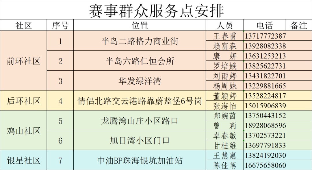 赛事期间,高新区也将在半岛二路格力商业街、半岛六路仁恒会所、华发绿洋湾、情侣北路交云港路靠蔚蓝堡6号岗、龙腾湾山庄小区路口、旭日湾小区门口、中油BP珠海银坑加油站设置7个便民服务点。