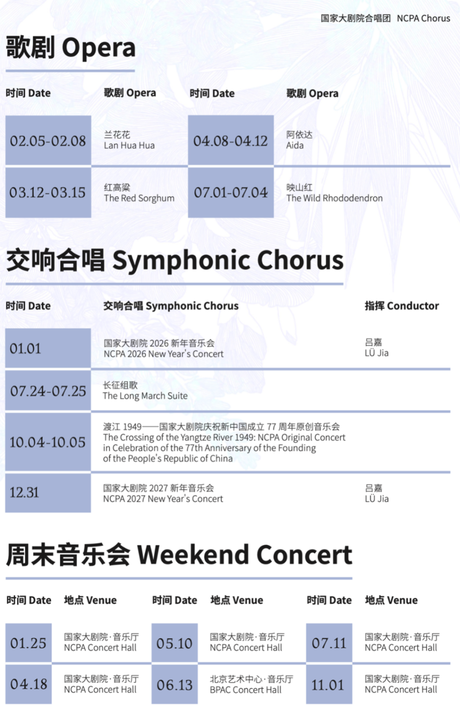 除五大板块音乐会外,国家大剧院合唱团将继续发挥音乐会、歌剧“两栖”实力,展现多元艺术风采。《长征组歌》以恢弘旋律纪念长征胜利90周年,讴歌伟大征程与不朽的革命精神。国庆期间的音乐会《渡江1949》,合唱团将与国家大剧院管弦乐团一同演出,致敬新中国成立77周年。同时,在乐季的上半程,合唱团将参演《兰花花》《红高粱》《阿依达》《映山红》四部国家大剧院原创、自制的中外歌剧。